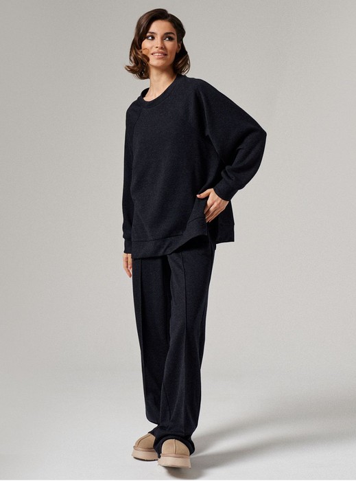 Комплект женский из трикотажного полотна для повседневной носки. Комплект состоит из брюк и джемпера. Джемпер свободный с длинным рукавом. Горловиа круглая. На передней и задней частях джемпера есть рельефные швы. Брюки прямые длинные на резинке, с боковыми карманами в боковых швах.