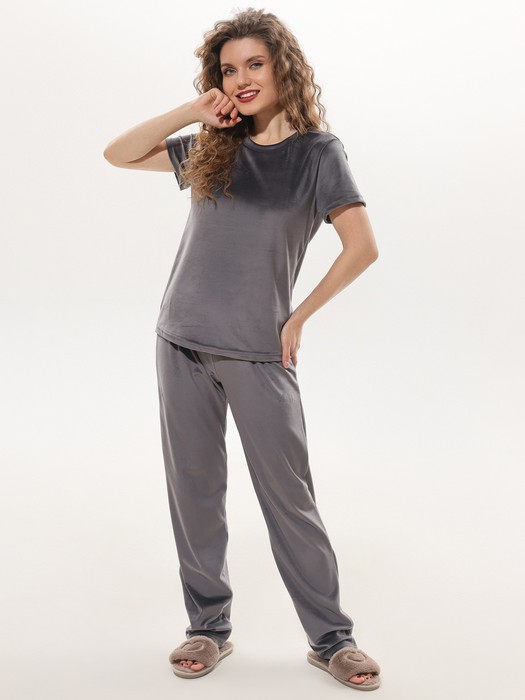 Костюм молодежный из трикотажного полотна «велюр-стрейч», состоящий из футболки и брюк. Футболка - классического покроя, с короткими втачными рукавами и горловиной овальной формы, обработанной втачной бейкой. Брюки – длинные, свободного покроя, с эластичной тесьмой по талии.