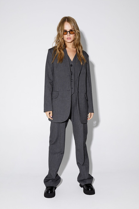 Костюм-двойка из свободного жакета и прямых брюк со стрелками из текстильной ткани с рисунком «ёлочка». Детали: жакет с расширенной линией плеча, полуприлегающий силуэт, пиджачный воротник, талевые вытачки, перед с функциональным нагрудным карманом и двумя прорезными карманами с клапанами, застежка на пуговицы, спинка со средним швом, рукава втачные двухшовные, жакет на подкладке. Брюки с высокой посадкой на притачном поясе со шлевками, застежка на молнию и пуговицу, боковые карманы, передние половины с заутюженными стрелками и двумя небольшими складками