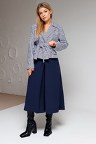 Классический костюм-двойка из двубортного жакета и укороченных брюк со стрелками. Детали: жакет полуприлегающего силуэта, пиджачный воротник, перед с прорезными карманами, двубортная застежка на петли и пуговицы, спинка со средним швом, рукава втачные двухшовные, жакет на подкладке. Брюки со средней посадкой, притачной пояс со шлевками, передние половины с небольшими мягкими складками и заутюженными стрелками, застежка на молнию и пуговицу, боковые карманы.