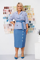 Длина жакета по спинке около 66 см в размерах 40-46 и около 69 см в размерах 48-52, длина рукавов около 61 см. Длина брюк по боковому шву с поясом около 97 в размерах 40-46 и около 98,5 см в размерах 48-52, длина по внутреннему шву около 70 см.