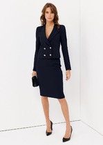 Костюм-двойка из укороченного оверсайз жакета с расширенными плечами и миди-юбки с разрезом. Детали: прямой силуэт, спущенная линия плеча, пиджачный воротник, перед с функциональным нагрудным карманом, застежка двубортная на петли и пуговицы, рукава втачные двухшовные, жакет на подкладке. Юбка асимметричного кроя с высоким разрезом по переду, притачной пояс со шлевками, застежка на молнию и пуговицу, боковые карманы.