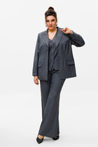 Длина жакета по спинке около 69 см в размерах 40-46 и около 72 см в размерах 48-52, длина рукавов около 62 см. Длина брюк по боковому шву с поясом около 113 см в размерах 40-46 и около 114,5 см в размерах 48-52, длина по внутреннему шву около 82 см.