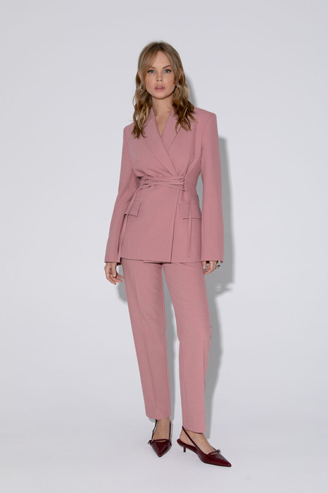 Текстильный костюм-двойка из жакета со шнуровкой с расширенной линией плеч и классических укороченный брюк со стрелками.
