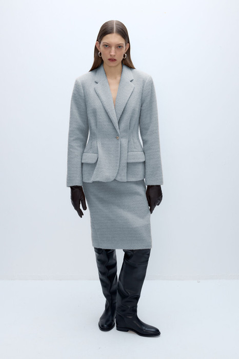 Костюм-двойка из укороченного приталенного жакета со складками и юбки-карандаш из пушистой ткани.