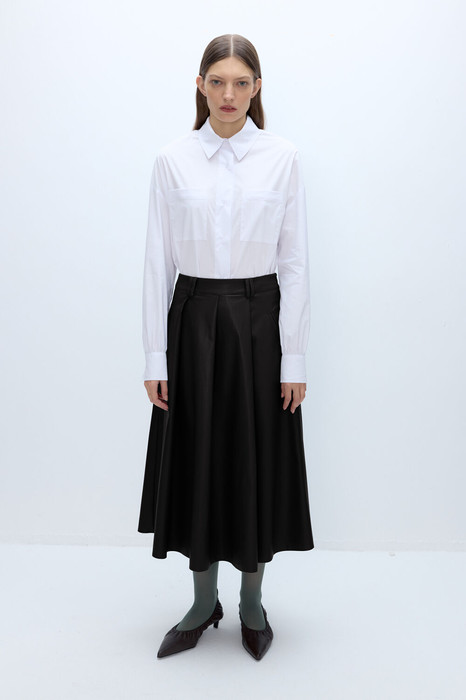 Комплект-дво йка из хлопковый оверсайз рубашки и миди-юбки из экокожи.