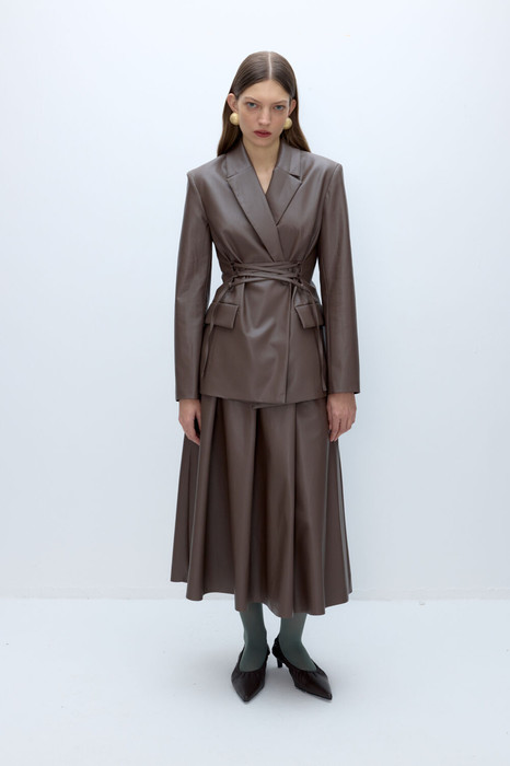 Костюм-двойка из жакета со шнуровкой по талии и миди-юбки из экокожи.