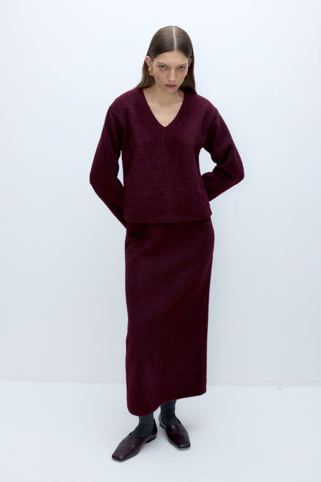 Костюм-двойка из свободного джемпера и прямой миди-юбки из пушистой ткани.