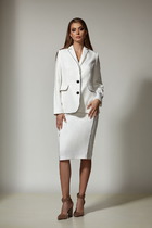 Детали: спущенная линия плеча, V-образный вырез горловины переда, длинные рукава с разрезами по низу, разрезы по бокам переда и спинки. Юбка прямого силуэта, пояс на резинке и без застежки, средний шов спинки с разрезом, без подкладки.