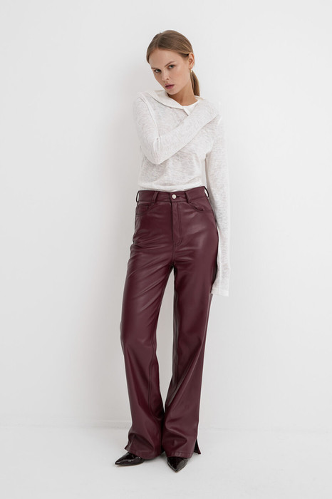 Комплект-двойка из базового лонгслива с капюшоном и прямых брюк из экокожи. Детали: лонгслив прямого силуэта, втачные удлиненные рукава. Перед и спинка удлиненные, что позволяет формировать драпировку по талии. Брюки с высокой посадкой, прилегающий силуэт, притачной пояс со шлевками, застежка на молнию и пуговицу, перед с боковыми карманами, спинка с кокеткой и двумя накладными карманами, разрезы по низу боковых швов. Изнанка экокожи с небольшим ворсом.