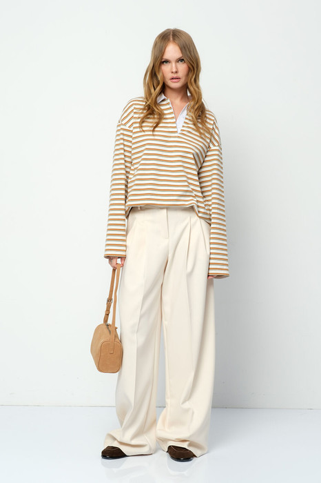 Комплект-двойка из свободного трикотажного поло в полоску и текстильных брюк-палаццо.