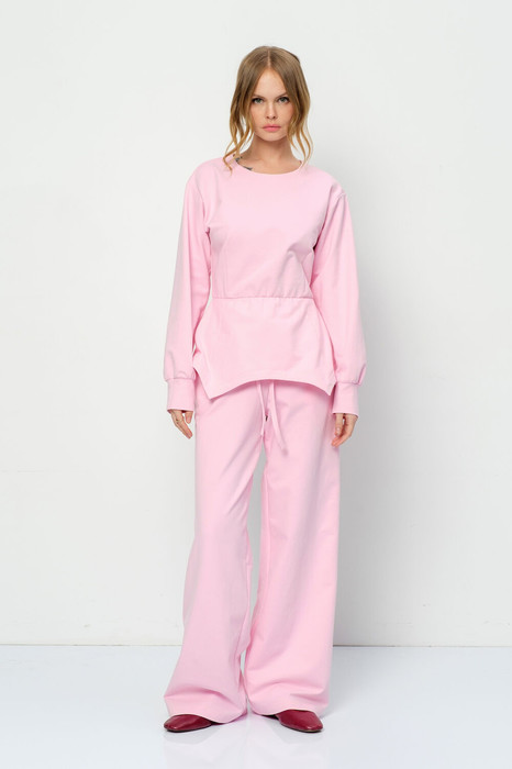 Детали: джемпер полуприлегающего силуэта, спущенная линия плеча, круглый вырез горловины, талия на резинке, застежка на потайную молнию в среднем шве спинки, рукава длинные с манжетами, фигурный низ. Брюки с высокой посадкой, эластичный пояс с резинкой, боковые карманы, без застежки. Костюм из трикотажа футер трехнитка.