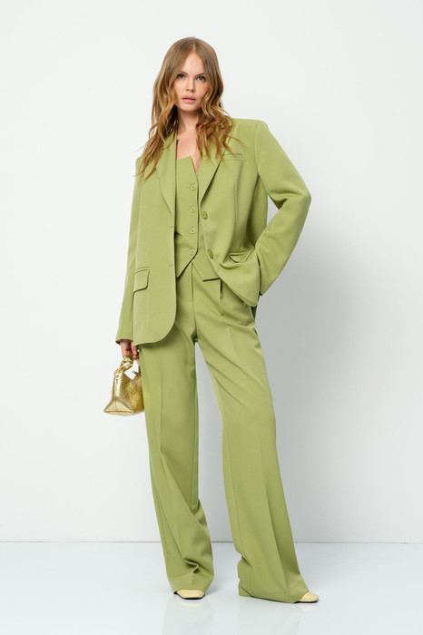 Костюм-тройка из оверсайз жакета, топа-корсета и прямых широких брюк со стрелками.