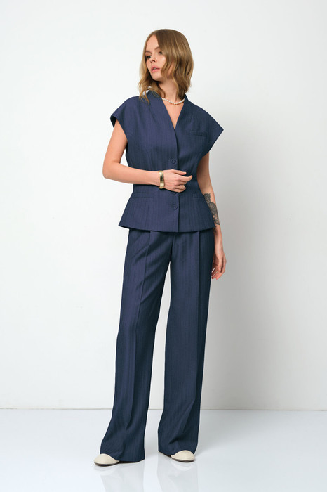 Детали: полуприлегающий силуэт, цельнокроеный воротник-стойка, рельефные швы переда и спинки, функциональные карманы, застежка на петли и пуговицы, жилет на подкладке. Брюки с притачным поясом со шлевками, передние половины с небольшими застроченными мягкими складками и заутюженными стрелками, застежка на молнию и пуговицу, боковые карманы. Задние части брюк с вытачками и заутюженными стрелками. Пояс брюк прямой, без резинки.