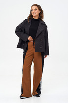 Детали: прилегающий силуэт, воротник с застежкой-поло, втачные длинные рукава расширенные к низу. Юбка прямого силуэта, пояс на резинке, спинка с высоким разрезом. Юбка на трикотажной подкладке.