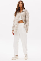 Полупрозрачный костюм-двойка из свободной рубашки и широких брюк на резинке.