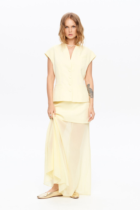 Костюм-двойка из приталенного жилета с воротником-стойкой и макси-юбки.