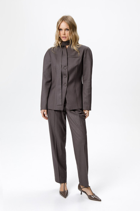 Костюм-двойка из приталенного жакета с акцентными плечами и укороченных классических брюк со стрелками.