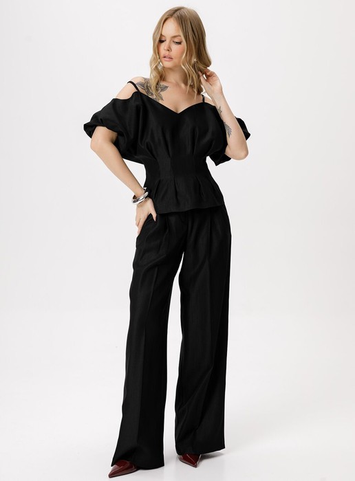 Костюм-двойка из приталенной блузы со складками и широких брюк-палаццо со стрелками.