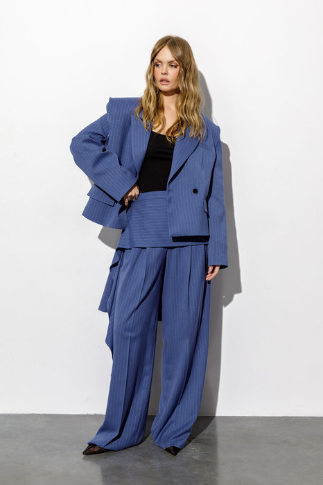 Костюм-тройка из укороченного оверсайз жакета с необработанными проймами, широких брюк-палаццо и съемной юбки-баски килт из текстильной ткани в полоску.