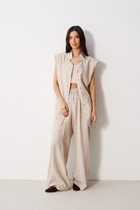 Костюм-тройка из оверсайз жакета, топа-корсета и прямых брюк-палаццо со стрелками.