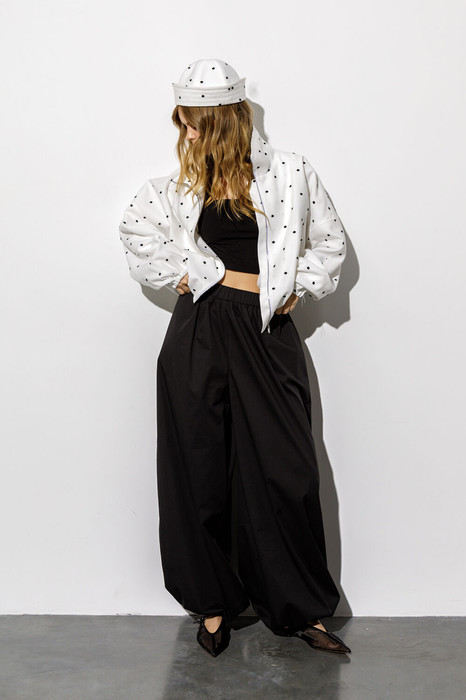 Комплект-тройка из укороченной ветровки О-силуэта, панамы в горошек и широких свободных брюк-алладинов.