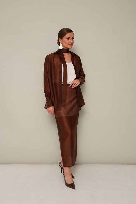 Элегантный 3-предментный комплект, состоящий из топа, блузки и юбки.