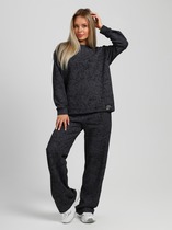 Костюм женский из гладкокрашеного трикотажного полотна "кулирка с лайкрой" состоящий из футболки и брюк. Футболка – классического покроя, с короткими втачными рукавами и горловиной овальной формы, обработанной втачной планкой, на полочке выполнен принт в технике "шелкографии".Брюки – длинные, классического кроя, на притачном поясе с эластичной тесьмой внутри и карманами в боковых швах. Передние половины брюк застрочены по центральным линиям. По центру пояса настрочен декоративный элемент.