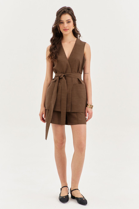 Комплект, состоящий из жилетки и шорт. Жилетка свободного кроя, длиной чуть ниже линии бедер. Спинка со средним швом, в котором обработана шлица. Перед с талиевой вытачкой, переходящей в карман. Карман прорезной с листочкой. Вырез V-образный, без воротника. Жилетка без застежки, на подкладке, с плечевыми накладками. Жилетку дополняет съемный пояс. Шорты свободного кроя, длиной чуть выше середины бедра. По задним половинкам талиевые вытачки, прорезные карманы-«обманки» с листочкой. По передним половинкам застрочены стрелки, обработаны боковые карманы с наклонным входом. Застежка с гульфиком и откоском на тесьму-«молнию». Шорты на притачном поясе-обтачке. По поясу вставлены шлевки. Застежка по поясу на петлю и пуговицу.