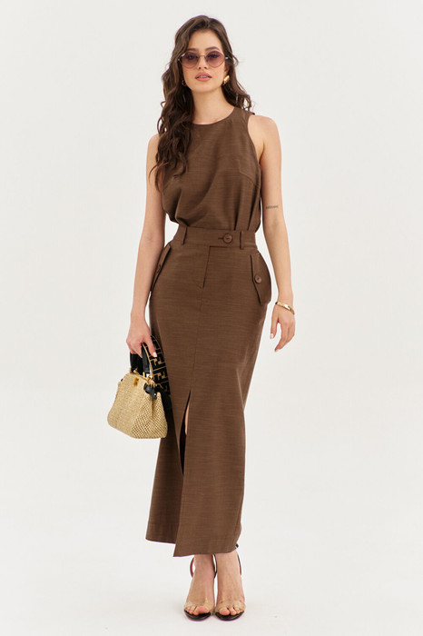 Комплект женский, состоящий из блузки и юбки. Блузка свободного кроя, длиной до бедер. Спинка со средним швом, в котором по горловине обработана застежка на навесную петлю и пуговицу. По переду нагрудные вытачки. Блузка без рукавов, с фигурной проймой. Горловина округлой формы. Юбка прямого силуэта, длиной чуть ниже щиколотки. Заднее полотнище с талиевыми вытачками и средним швом. Переднее полотнище со средним швом, в котором обработан высокий разрез, с боковыми карманами с наклонным входом с клапанами. На клапанах пришиты пуговицы. В среднем шве переда обработана застежка на тесьму-«молнию» с гульфиком и откоском. юбка на притачном поясе с фигурным уступом по переду, с резинкой по спинке. По поясу вставлены шлевки. Пояс с застежкой на петлю и пуговицу. По поясу застежка на петлю и пуговицу.