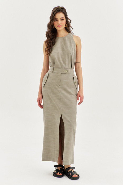 Комплект женский, состоящий из блузки и юбки. Блузка свободного кроя, длиной до бедер. Спинка со средним швом, в котором по горловине обработана застежка на навесную петлю и пуговицу. По переду нагрудные вытачки. Блузка без рукавов, с фигурной проймой. Горловина округлой формы. Юбка прямого силуэта, длиной чуть ниже щиколотки. Заднее полотнище с талиевыми вытачками и средним швом. Переднее полотнище со средним швом, в котором обработан высокий разрез, с боковыми карманами с наклонным входом с клапанами. На клапанах пришиты пуговицы. В среднем шве переда обработана застежка на тесьму-«молнию» с гульфиком и откоском. юбка на притачном поясе с фигурным уступом по переду, с резинкой по спинке. По поясу вставлены шлевки. Пояс с застежкой на петлю и пуговицу. По поясу застежка на петлю и пуговицу.