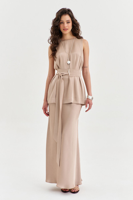 Комплект женский, состоящий из блузки и юбки. Блузка свободного кроя, длиной ниже линии бедер. Спинка со средним швом, в котором по горловине обработана застежка на навесную петлю и пуговицу. По переду нагрудные вытачки. Блузка без рукавов. Горловина округлой формы. блузку дополняет съемный пояс. Юбка А-образного силуэта, длиной чуть ниже щиколотки. Верхний срез юбки обработан резинкой.