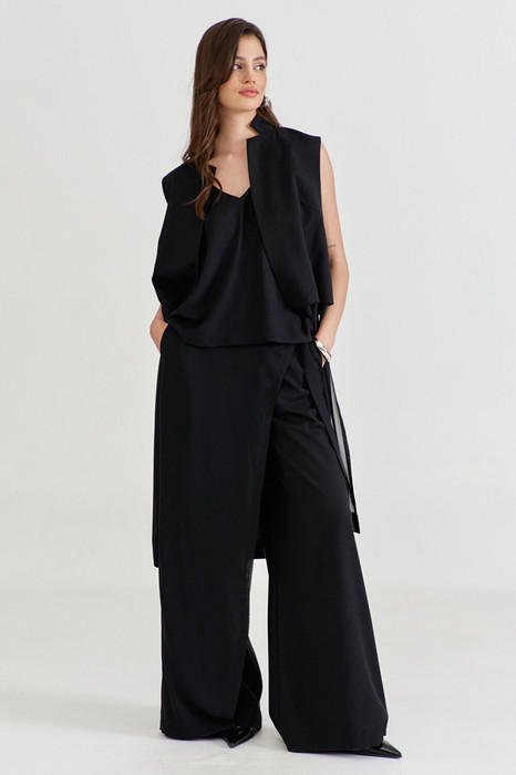 Комплект, состоящий из жилетки, топа и брюк. Жилетка свободного кроя, длиной выше колена. Спинка со средним швом, в котором обработан разрез. Перед с нагрудной вытачкой. Пройма глубокая, квадратной формы. Воротник пиджачного типа со стойкой. Жилетку дополняет шифон по спинке и переду. Жилетка без застежки на подкладке. Топ на бретелях, двойной, длиной выше бедер, с неровной линией низа (спинка удлинена). По переду топа нагрудные вытачки. Брюки длинные, широкие, на притачном поясе с резинкой. По спинке талиевые вытачки. По переду, с правой стороны, вставлена деталь из шифона, выполнена в виде запаха, которая крепится с левой стороны при помощи пояска и паты с полукольцами. В боковых швах обработаны карманы.
