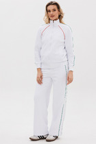 Костюм женский предназначен для повседневной носки: блузон и юбка. Блузон полуприлегающего силуэта, длиной до линии бедер. Перед с правой отрезной одной кокеткой, с двумя рельефами, выходящими из плечевых швов, проходящими через центр груди. Спинка с двумя талиевыми вытачками и средним швом. Застежка на потайную тесьму-молнию в среднем шве спинки. Горловина фигурная, обтачная, без воротника, декорирована украшением. Рукав двухшовный, длиной 3/4. Локтевой шов с фигурным разрезом, декорированным металлическим украшением. Низ переда блузона обтачной, внизу шва притачивания левого рельефа фигурный разрез, декорированный тремя украшениями. Юбка слегка заужена книзу длиной за колено. Переднее полотнище с двумя талиевыми вытачками. Заднее полотнище со средним швом и двумя талиевыми вытачками. Застёжка на потайную тесьму-молнию в среднем шве заднего полотнища, который заканчивается шлицей. Верхний срез с притачным поясом. Юбка на подкладке. Длина спинки блузона 52 см. длина рукава 47 см. длина юбки 70,5 см