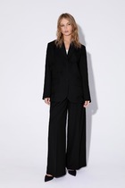 Костюм женский относится к нарядной торжественной одежде состоит из блузки и юбки. Блузка полуприлегающего силуэта, длиной до линии бедер. Перед с двумя нагрудными вытачками, с притачной планкой по горловине из отделочной ткани. Спинка с отрезной кокеткой, декорированной настрочным кружевом с двумя завязками, фиксирующимися по горловине в бант. Горловина с V-образным вырезом обработана косой бейкой. Рукав втачной, короткий, одно шовный со сборкой по окату. Блузка без плечевых накладок. Юбка полу солнце, длиной до середины икры. Переднее полотнище с двумя односторонними складками, с карманами в боковых швах. Заднее полотнище цельнокроеное. Застежка на потайную тесьму-молнию в левом боковом шве. Юбка с притачным поясом с застежкой на пришивную пуговицу. Пояс с двумя настрочными шлевками. Длина блузки 62 см. Длина рукава 20.5 см. Длина юбки 75 см