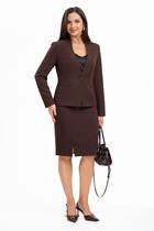 Костюм женский предназначен для повседневной носки. Костюм женский 2-х предметный жакет и юбка. Жакет женский полу прилегающего силуэта, длиной до линии бёдер. Перед с 2-мя талиевыми вытачками, с 2-мя накладными карманами, с 2-мя закруглёнными концами, с 2-мя прямоугольными клапанами, фиксирующиеся к карманам на петли обмётанные и пришивные пуговицы. Спинка со средним швом и 2-мя талиевыми втачками. Горловина круглая, обточная, без воротника. Застёжка центральная бортовая на 5-ть обмётанных петель и 5-ть пришивных пуговиц. Рукав втачной, 2-х шовный, длиной 3/4. Жакет с приточной подкладкой. Жакет с плечевыми накладками. Юбка женская "карандаш" длиной за колено. Переднее полотнище цельнокроеное. Заднее полотнище с 2-мя талиевыми выточками со средним швом, заканчивающимся шлицей. Застёжка на потайную тесьму-молнию В среднем шве заднего полотнища. Юбка с приточным поясом, собранным по бокам на эластичную тесьму с застёжкой на 1-ну обмётанную петлю и 1-ну пришивную пуговицею Юбка на подкладке. Длина спинки жакета 57 см,  длина рукава 47 см, длина юбки по боковому срезу 61 см.