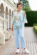 Костюм женский, предназначен для повседневной носки. Костюм женский 2-х предметный жакет и юбка. Жакет прямого силуэта, длиной до линии бёдер. Перед с 2-мя нагрудными вытачками, с 2-мя накладными прямоугольными карманами с притачной обточкой из отделочной ткани вверху; с приточными планками по горловине и краю борта из отделочной ткани. Спинка цельнокроеная. Жакет с притачной планкой по низу из отделочной ткани. Горловина круглая обточная, без воротника. Застёжка центральная, бортовая на 7-мь обмётанных петель и 7-мь пришивных пуговиц. Рукав втачной, одно шовный, длинный, внизу со встречной складкой и лёгкой сборкой, с притачной манжетой из отделочной ткани. Перед и спинка жакета на подкладке. Жакет с плечевыми накладками. Юбка женская карандаш, длиной до нижней части икры. Переднее полотнище цельнокроеное. Заднее полотнище с 2-мя таллиевыми вытачками и средним швом, заканчивающимся разрезом. Юбка с притачным поясом, собранным на эластичную тесьму. Юбка на подкладке. Длина спинки жакета 62 см, длина рукава 61,5 см. Длина юбки по боковому срезу 83 см.