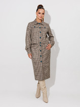 Костюм предназначен для повседневной носки. Костюм женский 2-х предметный жакет брюки. Жакет женский прямого силуэта, длиной ниже линии бёдер. Перед с 2-мя отрезными кокетками, с 2-мя прямоугольными накладными карманами, фиксирующимся к карманам на металлические кнопки. Спинка цельнокроеная. Горловина круглая с втачной стойкой. Застёжка центральная бортовая на разъёмную тесьму-молнию. Жакет со спущенным плечом. Рукав втачной из отделочной ткани с притачной планкой по центру, длинный, низ рукава со сборкой и притачной манжетой. Жакет без плечевых накладок. Брюки женские длинные прямые. Передние половинки с карманами в боковых швах, с декорированными защипами по центру шириной 0,5 см. Задние половинки с таллиевыми вытачками. Боковые швы с разрезами. Брюки с притачным поясом, собранным на эластичную тесьму, закреплённую 2-мя отделочными строчками. Длина спинки жакета 62 см, длина рукава 51 см, ширина плеча 24 см. Дина брюк по боковому срезу 102 см.