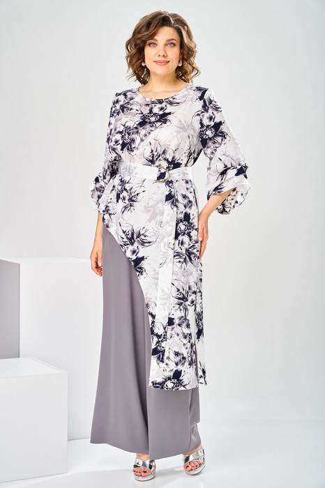 Костюм женский относится к торжественной одежде. Костюм женский 2-х предметный туника и брюки. Туника прямого силуэта, длиной до середины икры с ассиметричным подрезом переда и спинки. Перед с 2-мя нагрудными вытачками. Спинка цельнокроеная. Горловина круглая, обточная, без воротника. Рукав втачной, одно шовный, длиной 3/4, с 2-мя декоративными защипами, внизу шириной 3 см. Туника с плечевыми накладками. Брюки женские прямые длинные. Передние половинки с карманами в боковых швах. Задние половинки с таллиевыми вытачками. Брюки с притачным поясом, собранным на эластичную тесьму, закреплённую 2-мя отделочными строчками. К костюму прилагается съёмный пояс, фиксирующийся на металлическую пряжку. Длина брюк по боковому шву 105 см. Длина спинки туники 61 см, длина рукава 40,5 см.