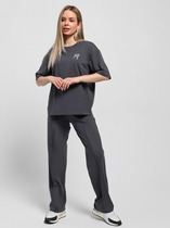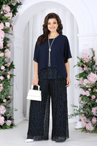 Костюм женский, предназначен для повседневной носки. Костюм женский 2-х предметный, блузон и юбка-брюки. Блузон женский прямого силуэта, длиной выше линии бёдер на 4 см. Перед с 2-мя нагрудными вытачками, с накладным отлётным прямоугольным карманом с клапаном, декорированным надстрочной аппликацией на левой части переда. Спинка цельнокроеная. Горловина круглая, обточная, без воротника. Рукав втачной одно шовный, длиной до локтя. Блузон без плечевых накладок. Юбка-брюки свободного покроя, длиной до нижней части икры. Передние половинки с отлётной отделочной деталью справа имитирующей запах. Передние половинки с карманами в боковых швах с отрезными бочками с 2-мя односторонними складками на линии талии. Юбка брюки с притачным поясом, частично собранным на эластичную тесьму, закреплённую 2-мя отделочными строчками. Длина юбки-брюк 83 см. Длина спинки блузона 53 см, длина рукава 31,5 см.