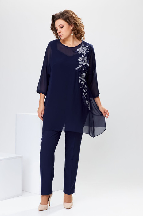 Комплект женский относится к нарядной торжественной одежде. Комплект женский трехпредметный: блузка, топ и брюки. Блузка женская прямого силуэта, с фигурным низом, со спущенной проймой. Перед цельнокроеный, декорирован кружевом. Спинка цельнокроеная.   Горловина круглая, обтачная, без воротника. Рукав одно шовный, длиной 7/8. Топ женский, длиной до линии бедер. Перед цельнокроеный, с двумя нагрудными вытачками. Спинка цельнокроеная. Горловина фигурная, обтачная. Бретели широкие обтачный. Брюки длинные, слегка заужены книзу. Передние и задние половинки с двумя талиевыми вытачками. Застежка на тесьму-молнию. Верхний срез с притачным поясом, застегивающимся на одну обметанную петлю и одну пришивную пуговицу. Между боковым швом и вытачкой на задних половинках собран на эластичную тесьму. Длина топа 57 см. Длина блузки 79.5 см, длина рукава 57-58-59 см соответственно. Длина брюк 102 см.
