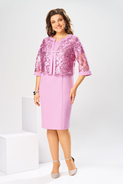Комплект женский, относится к торжественно-нарядной одежде. Комплект женский, 2-х предметный, жакет и платье. Жакет женский прямого силуэта, длиной до линии талии, выполнен из кружевного полотна. Перед с 2-мя нагрудными вытачками, с 2-мя притачными вертикальными планками, с притачными планками по горловине. Спинка с притачной планкой по горловине. Горловина круглая, обточная, без воротника. Застёжка на декоративный пришивной крючок. Рукав втачной одно шовный, длиной 3/4 с притачной манжетой. Жакет без плечевых накладок. Платье женской длиной за колено, полу прилегающего силуэта. Перед с 2-мя отрезными бочками. Спинка с 2-мя таллиевыми вытачками, со средним швом, заканчивающимся шлицей. Горловина круглая, обточная, без воротника. Застёжка на потайную тесьму-молнию в среднем шве спинки. Рукав втачной, короткий, одно шовный. Платье с плечевыми накладками. Длина спинки жакета 45 см, длина рукава 41 см. Длина спинки платья 100 см, длина рукава 19 см.