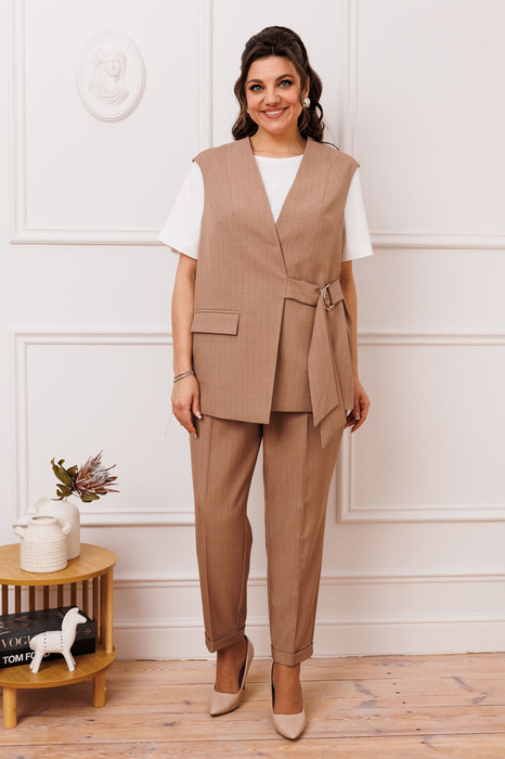 Комплект женский предназначен для повседневной носки. Комплект женский 3-х предметный, жилет, блузка и брюки. Жилет прямого силуэта, длиной ниже линии бёдер на 15 см. Перед с 2-мя нагрудными вытачками, выходящими из плечевых швов, с прорезным карманом с клапаном и 2-мя обтачками на правой части. Спинка со средним швом, заканчивающимся шлицей. Горловина с V-образным вырезом. Застёжка 2-х бортная на потайную петлю и пуговицу и на пояс, закреплённый на уровне линии талии и металлическую пряжку. Проймы обтачные. Жилет на притачной подкладке. Блузка женская прямого силуэта, длиной ниже линии бёдер на 5 см. Перед с 2-мя нагрудными вытачками. Спинка цельнокроеная. Горловина круглая с втачной планкой. Рукав втачной, короткий, одно шовный. Блузка без плечевых накладок. Брюки женские слегка заужены к низу, длиной 7/8. Передние половинки с односторонними складками и карманами в боковых швах, с отрезными бочками. Задние половинки с таллиевыми вытачками. Застёжка центральная на потайную тесьму-молнию. Брюки с притачным поясом, частично собранным на эластичную тесьму, с застёжкой на 1-ну горизонтальную обмётанную петлю и 1-ну пришивную пуговицу. Низ брюк с отложной манжетой, закреплённой по боковому шву. Длина спинки жакета 74,5 см. Длина брюк по боковому срезу 98 см. Длина спинки блузки 63 см, длина рукава 25,5 см.