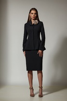 Комплект из костюмной ткани на подкладке, состоящий из жакета и юбки. Жакет прямого силуэта с нагрудными вытачками и прорезными карманами с клапанами. Воротник - стойка. Рукава - реглан, трехчетвертные. Жакет застегивается на пришивные кнопки. Юбка на подкладке, слегка зауженная к низу, с рельефами и поясом. В среднем шве заднего полотнища юбки - застежка-молния и шлица. Кант по краю борта, клапанам и рельефам юбки, отделочные пуговицы по жакету добавят стиля и элегантности.