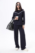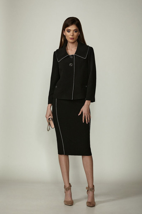 Комплект из костюмной ткани на подкладке, состоящий из жакета и юбки. Жакет прямого силуэта с нагрудными вытачками и прорезными карманами с листочками по переду. Воротник - широкий с отрезной стойкой, рукава – двухшовные, длиной 7/8. Застегивается 2 пуговицы и пришивные кнопки. Юбка на подкладке, слегка зауженная к низу, с рельефами и поясом.  В среднем шве заднего полотнища юбки - застежка-молния и шлица. Кант по краю борта, воротнику и рельефам юбки добавляет стиля и элегантности.