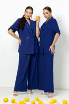 Брючный комплект из костюмной ткани на подкладке. Двубортный жакет выполнен в стиле оверсайз. Воротник-с отложными лацканами пиджачного типа, рукава – двухшовные. По переду- прорезные карманы с клапанами. Жакет имеет два ряда пуговиц, застегивается на две основные пуговицы, одну потайную, остальные пуговицы несут декоративный характер. Изюминка комплекта- декоративная булавка лимонного цвета. Брюки прямые со складкой, широким поясом-обтачкой, наклонными карманами. Застегиваются на молнию по переду и пуговицу. Съемная брошь в виде роскошной хризантемы ручной работы.