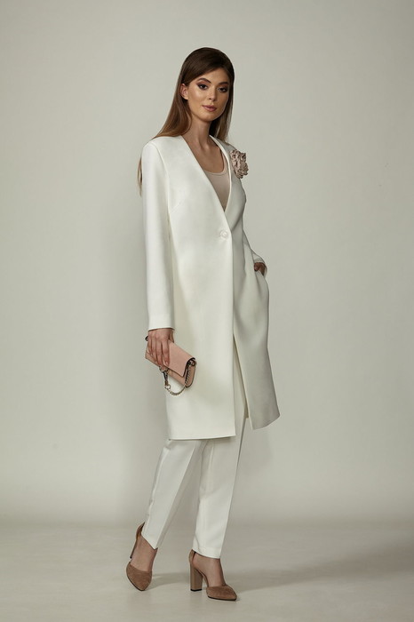 Брючный комплект из костюмной ткани на подкладке. Жакет прямого силуэта с двумя наклонными вытачками и карманами в боковых швах. Рукава - длинные, двухшовные. Жакет застегивается на 1 пуговицу. Цветок ручной работы в виде пиона станет украшением комплекта. Брюки слегка заужены к низу, с двумя наклонными карманами и поясом. Застегиваются на молнию по переду и одну пуговицу.