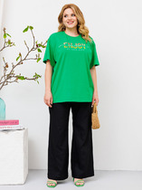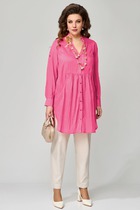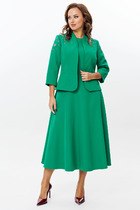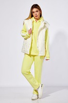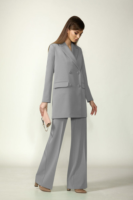 Брючный комплект из костюмной ткани на подкладке. Двубортный жакет выполнен в стиле оверсайз. Воротник-с отложными лацканами пиджачного типа, рукава – двухшовные. По переду- прорезные карманы с клапанами. Жакет имеет два ряда пуговиц, застегивается на две основные пуговицы, одну потайную, остальные пуговицы несут декоративный характер. Брюки прямые со складкой, широким поясом-обтачкой, наклонными карманами. Застегиваются на молнию по переду и пуговицу.