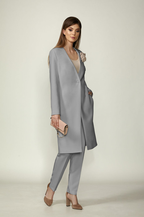 Брючный комплект из костюмной ткани на подкладке.  Жакет прямого силуэта с двумя наклонными вытачками и карманами в боковых швах. Рукава - длинные, двухшовные. Жакет застегивается на 1 пуговицу. Цветок ручной работы  в виде пиона станет украшением комплекта.  Брюки слегка заужены к низу, с двумя наклонными карманами и поясом.  Застегиваются на молнию по переду и  одну пуговицу.