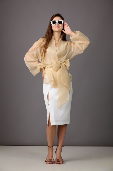 Прозрачная блуза из вуали немного расширена к низу, с планкой по горловине и бортам. Рукава-балон. Завязывается на пояс.